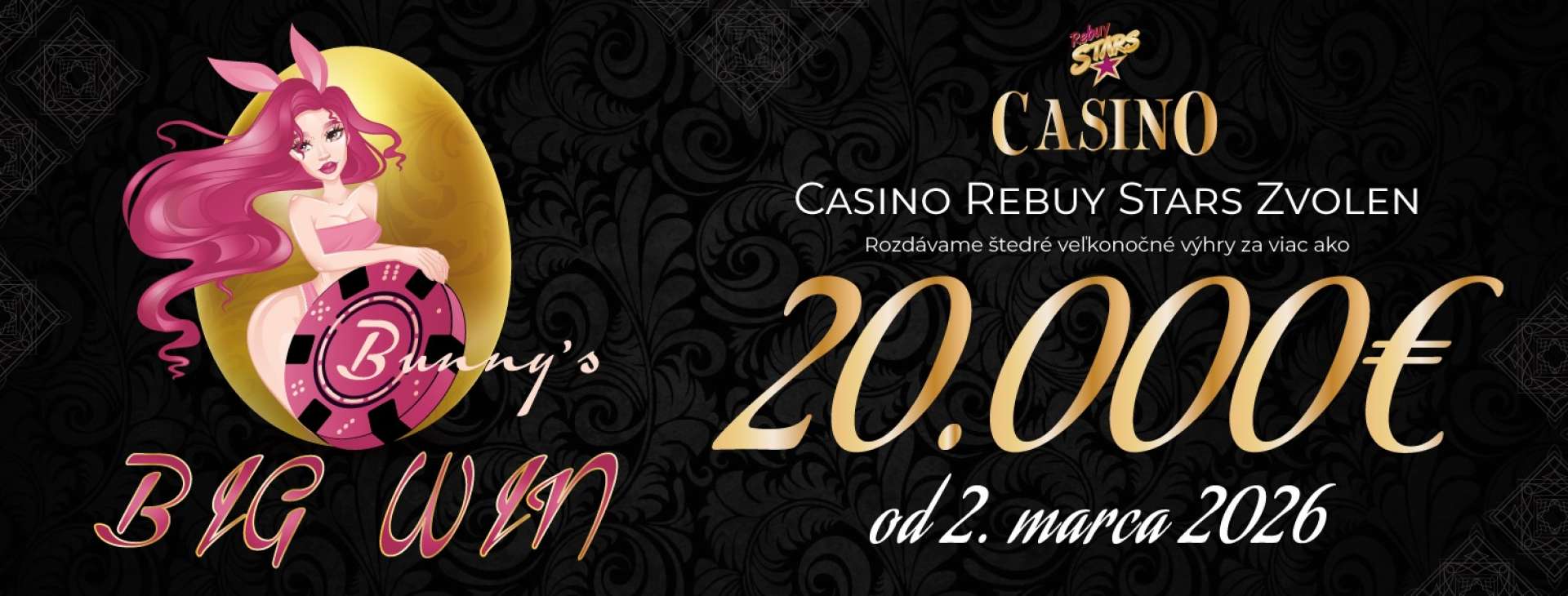 Veľkonočná atmosféra prichádza aj do zvolenského kasína Rebuy Stars. Bonus Bunny’s Big Win prináša aktívnym hráčom slotov možnosť získať okamžité výhry až do výšky 100 €. A ak sa pri stieraní objaví zlaté vajce alebo zlatý zajac, šťastie môže mať ešte oveľa sladšiu príchuť. Celkovo rozdáme v priebehu celého marca viac ako 20.000€!