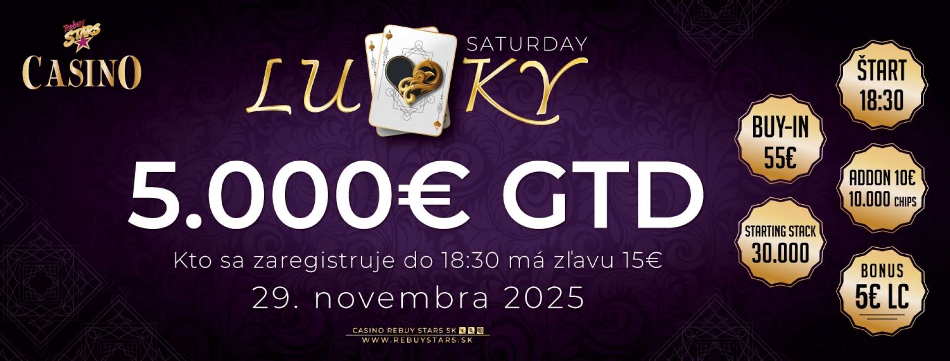 Obľúbený turnajový formát sa vracia do zvolenského kasína Rebuy Stars. Sobota bude patriť hráčom, ktorí sa neboja výziev. 10.000€ garancia turnaja SATURDAY CHALLENGER robí z 22.11. jeden z najsilnejších novembrových večerov.